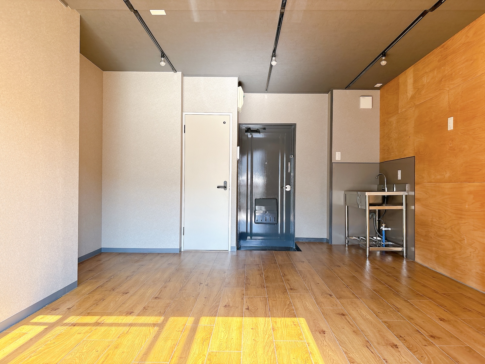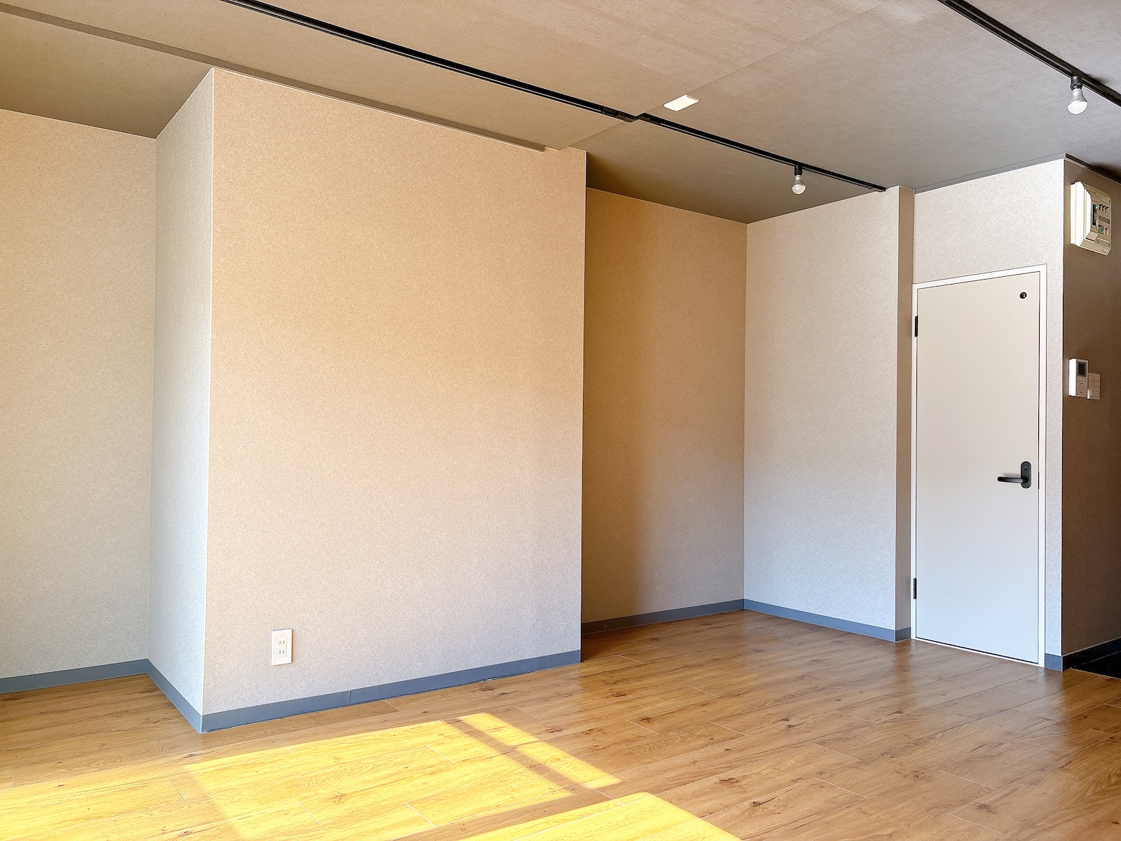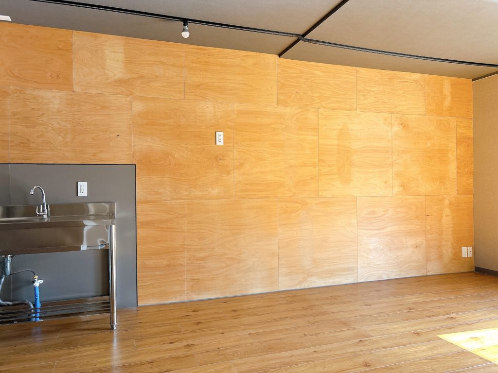東側の壁は合板仕上げで、小さなビスなどを打つことも可能。ライティングレールも備えているため、作品やアイテムを展示する際に便利。