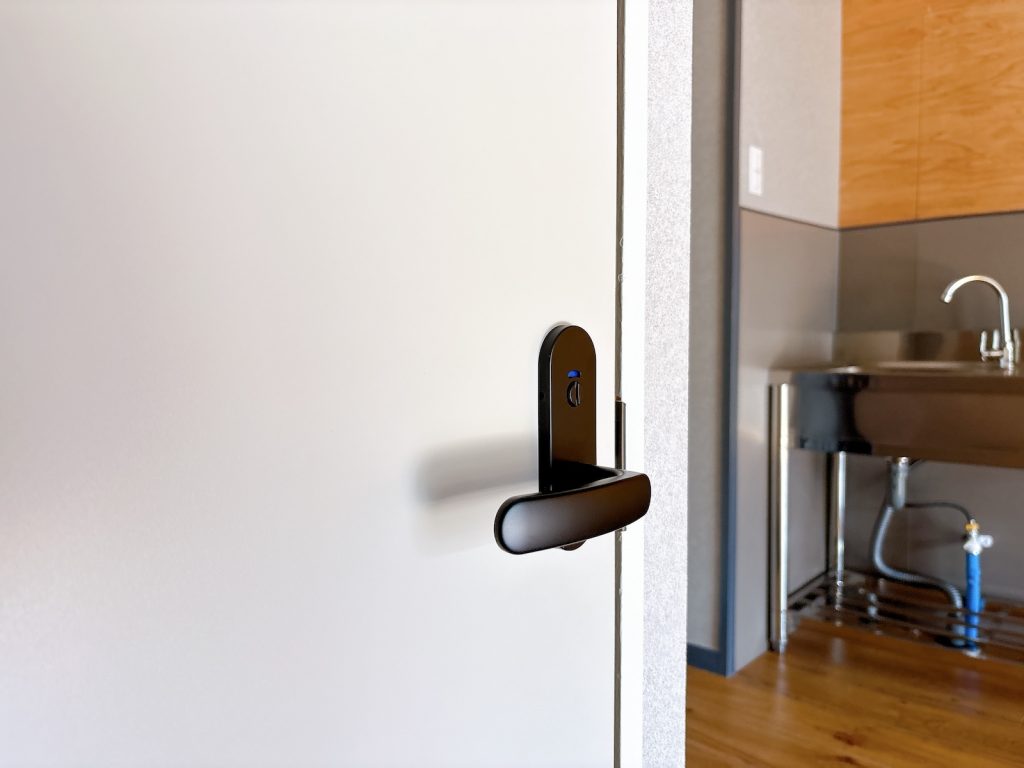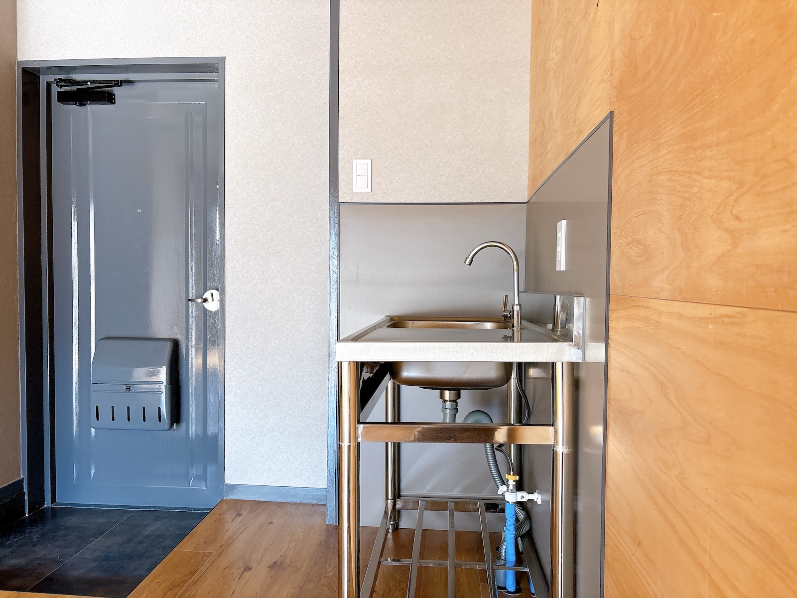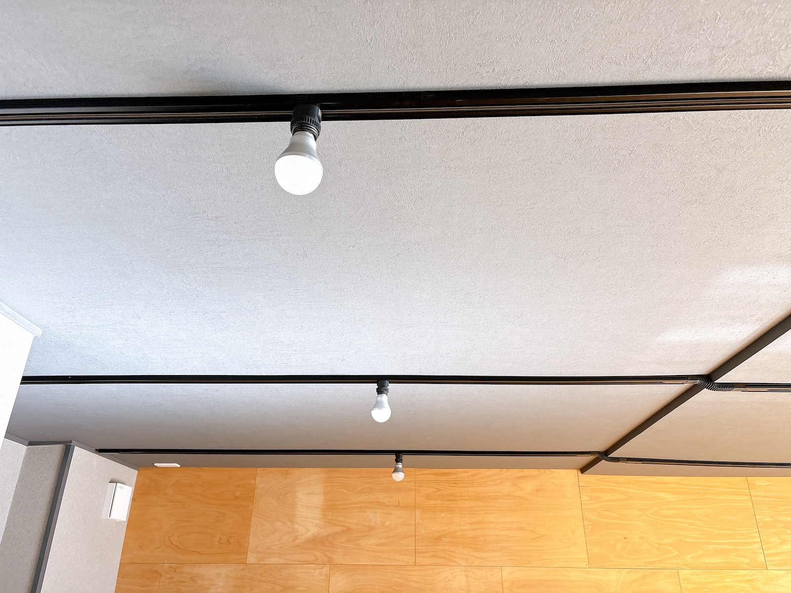 東側の壁は合板仕上げで、小さなビスなどを打つことも可能。ライティングレールも備えているため、作品やアイテムを展示する際に便利。