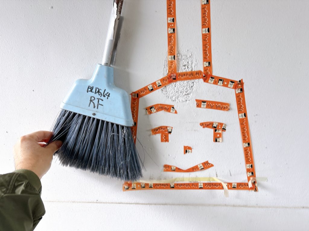 塔屋の壁にかけられていたホウキ。ずらしてみるとマスキングテープで可愛く絵が書かれていました。この絵のおかげでホウキが行方不明にならなくなったとのこと。きちんと片付けたくなる仕掛け。ナイスアイディア。