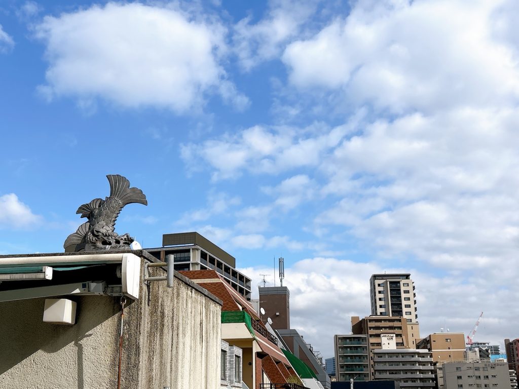いくつかベンチが置かれていてのんびりできます。オーニングの下にはダブルで設置されていて広々。昼寝もできそう。屋根の上にはシャチホコが!至る所にオーナーの遊び心を感じるビル。