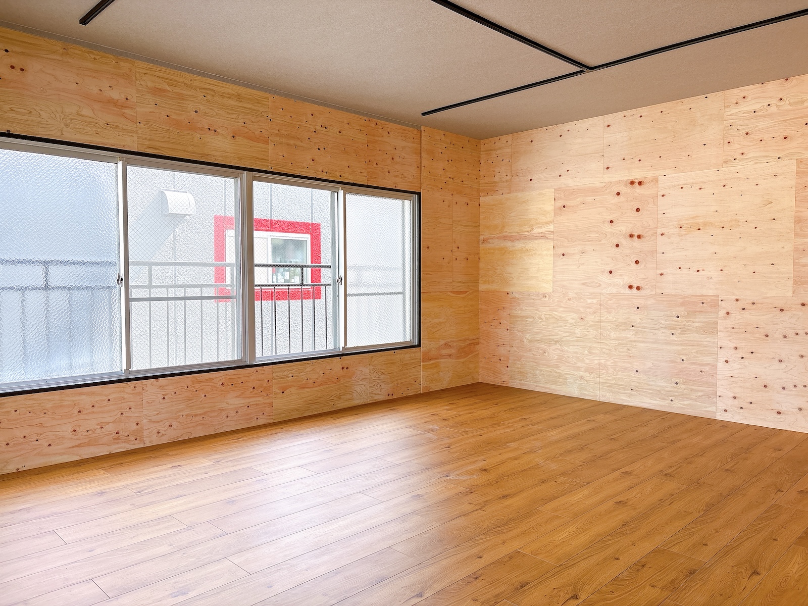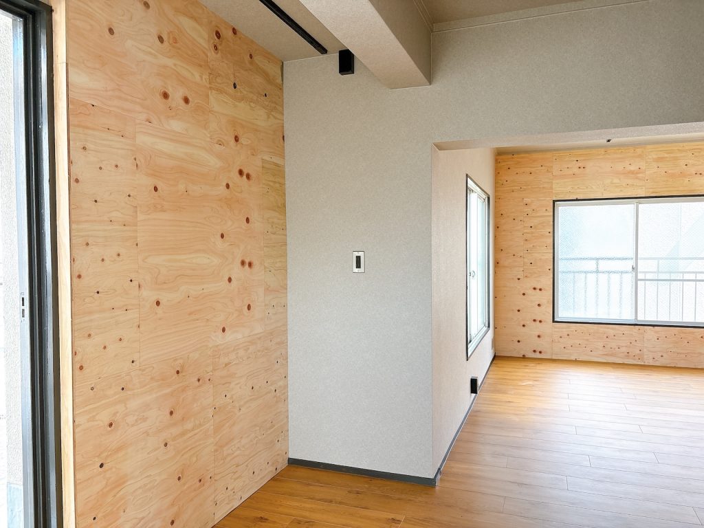 壁の一部は合板仕上げで、ビス打ちも可能。