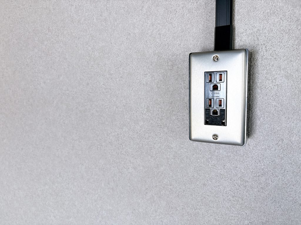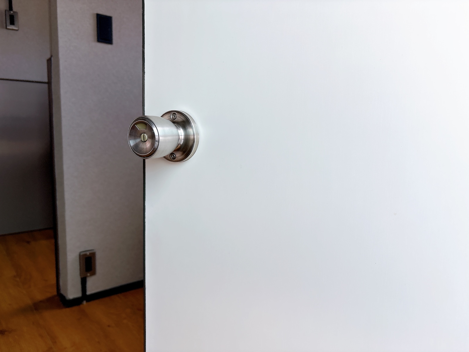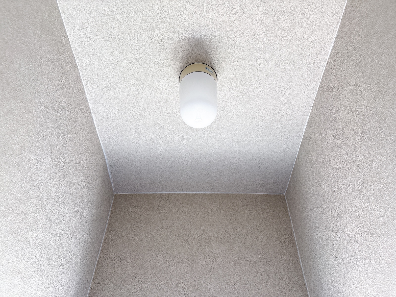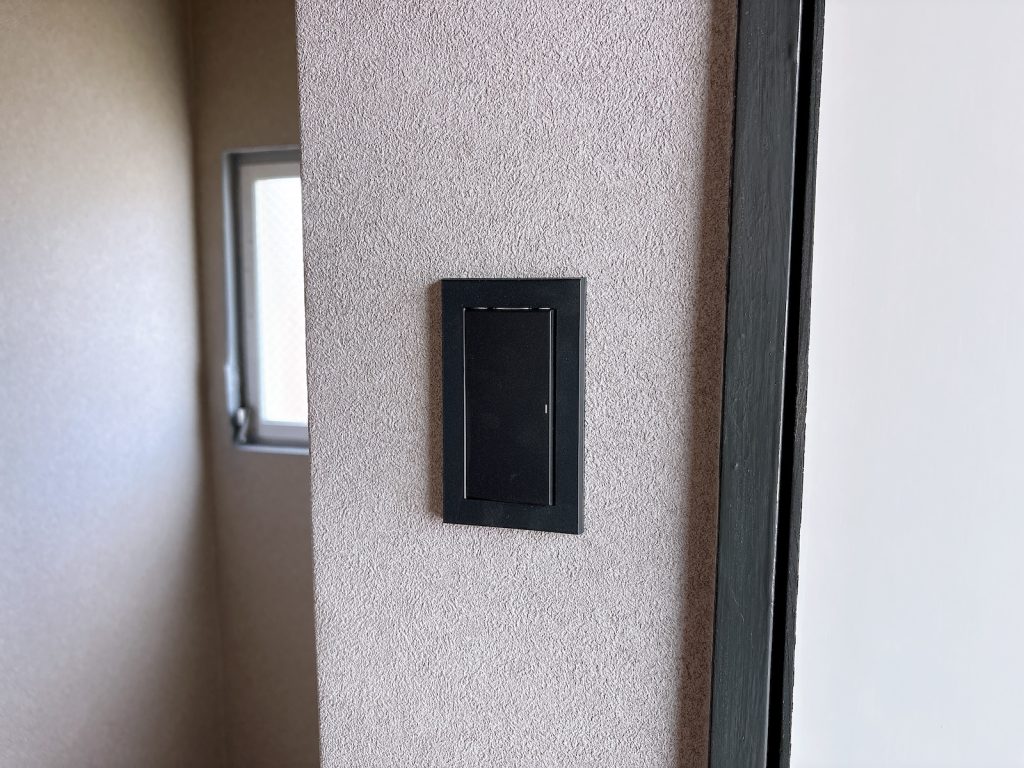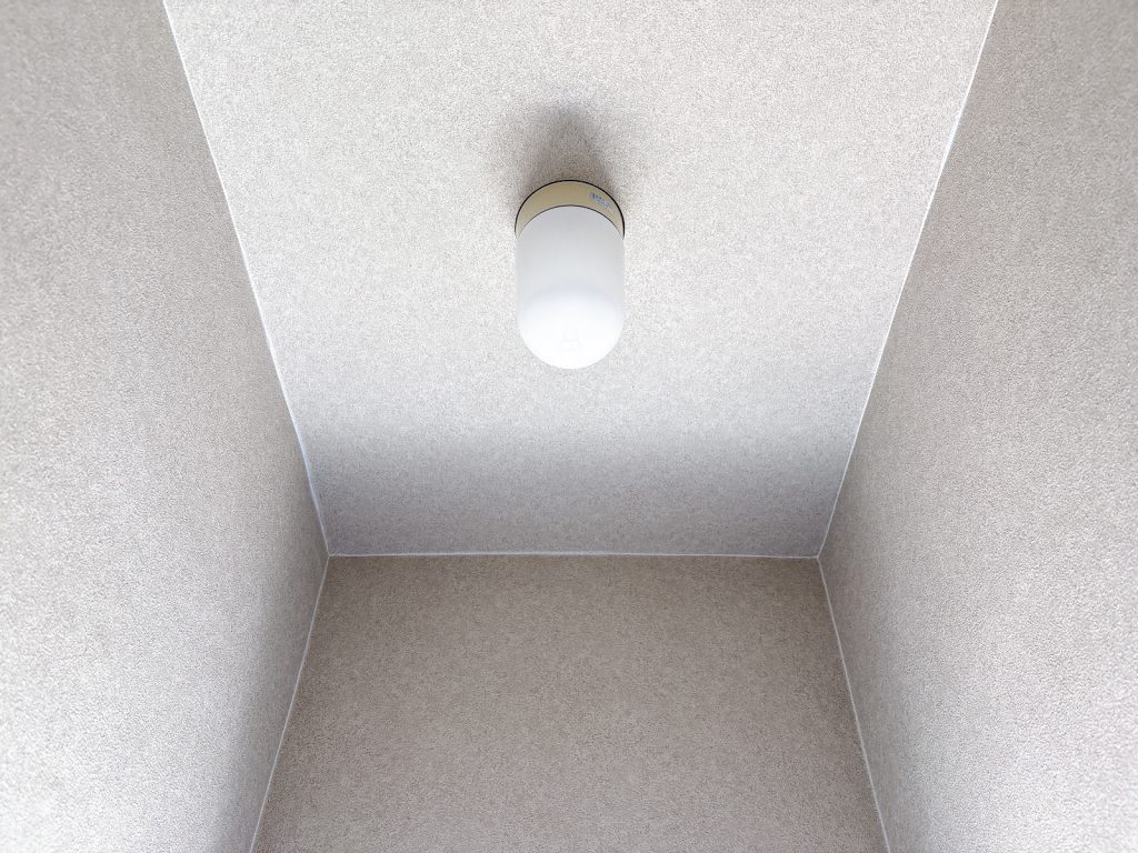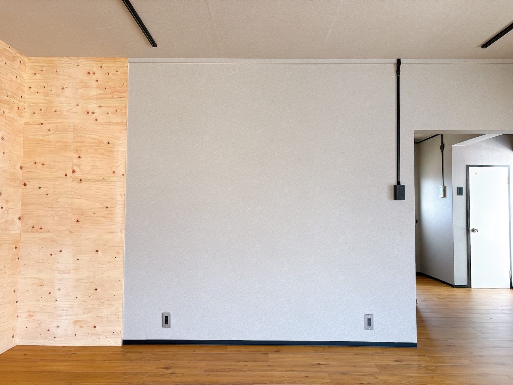 マットなライトグレーのクロスと合板の壁面。