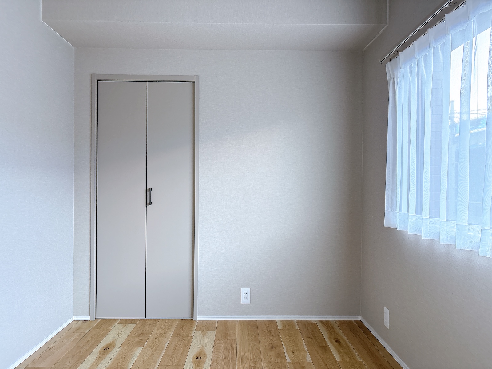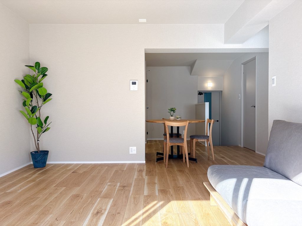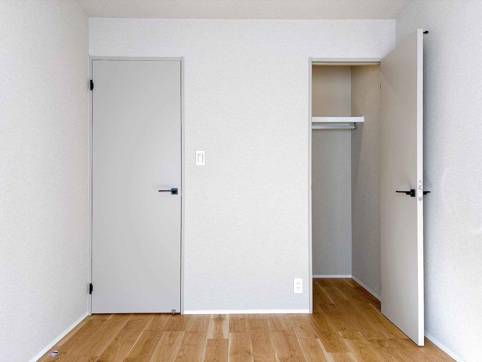 質感の良いナチュラルなフローリングとライトグレーの建具等からなる、プレーンでグレイッシュなデザイン。
