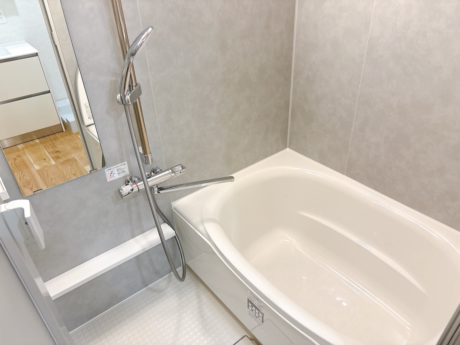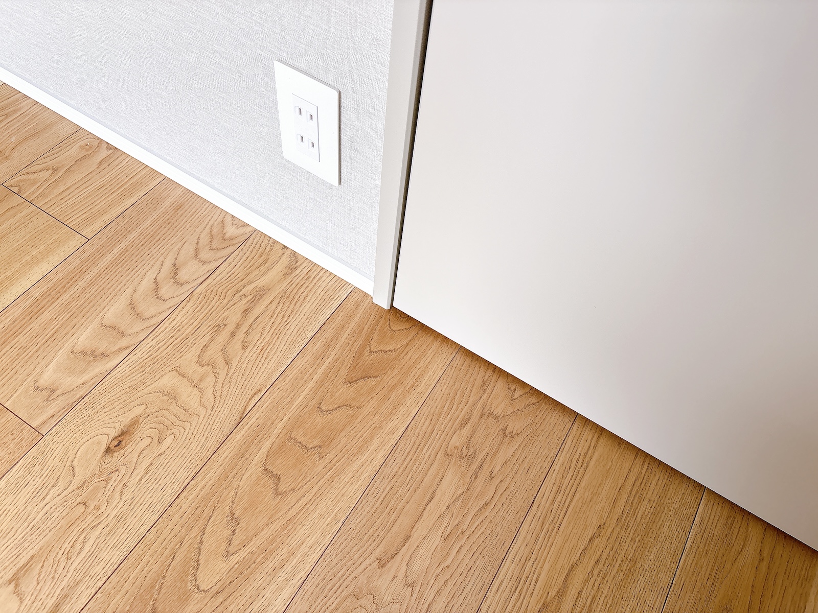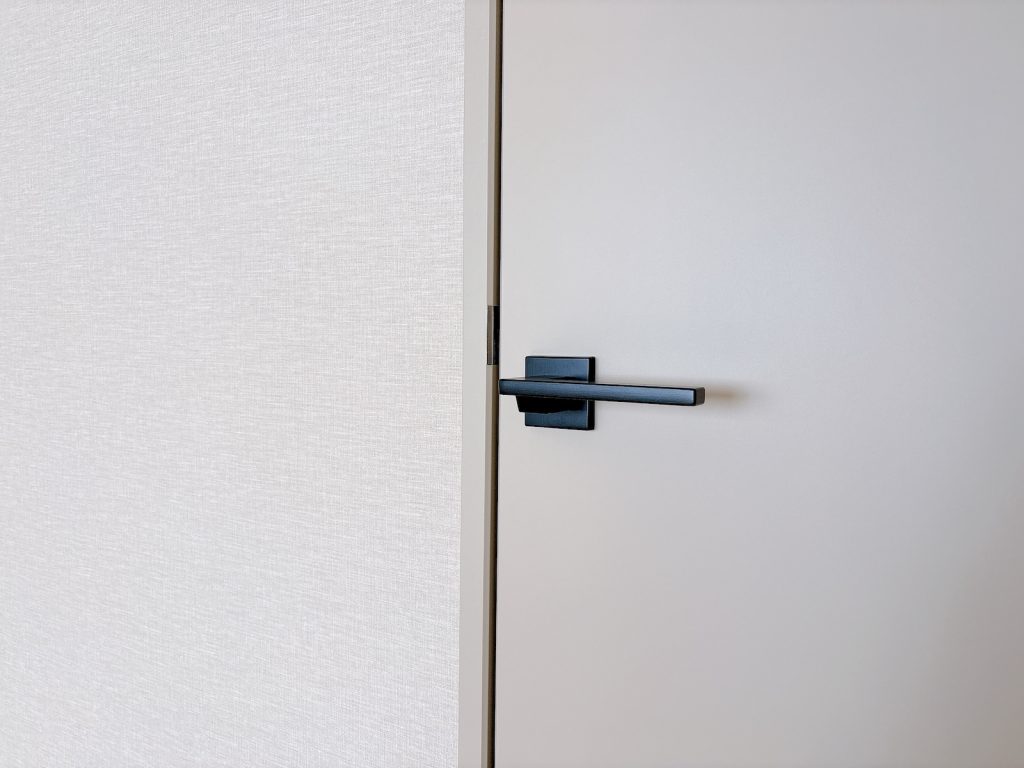 質感の良いナチュラルなフローリングとライトグレーの建具等からなる、プレーンでグレイッシュなデザイン。