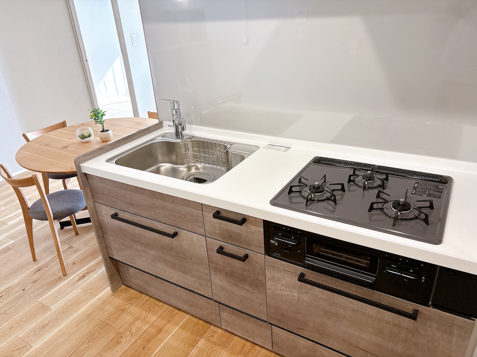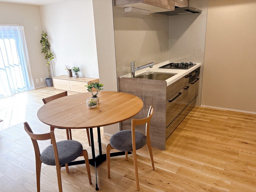 キッチンはW1800。写真の丸テーブルはφ1100。普通の長方形の食卓だったらW1500まで無理なく置けます。