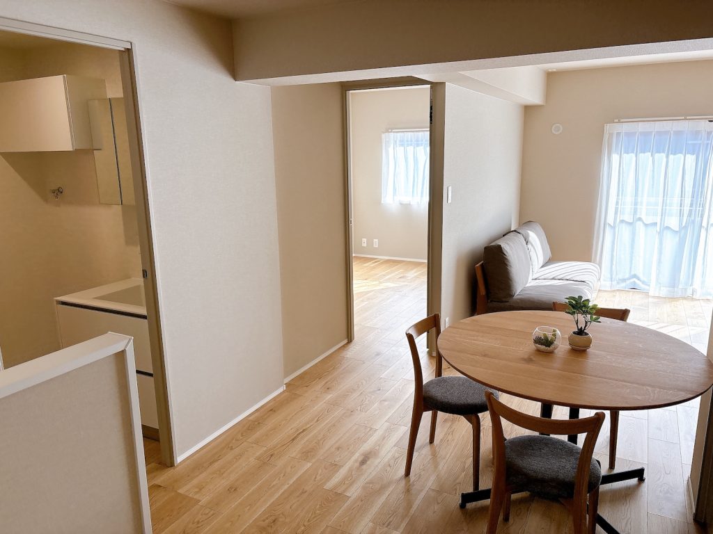 フルリノベーション済み。階段3段分の床レベル差が空間に変化をもたらすユニークなつくり。