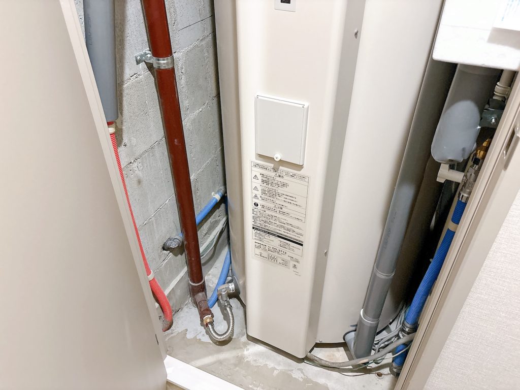 トイレ横のドアの中に電気温水器が……空間に余裕があるので、ホウキなどを収納することも。
