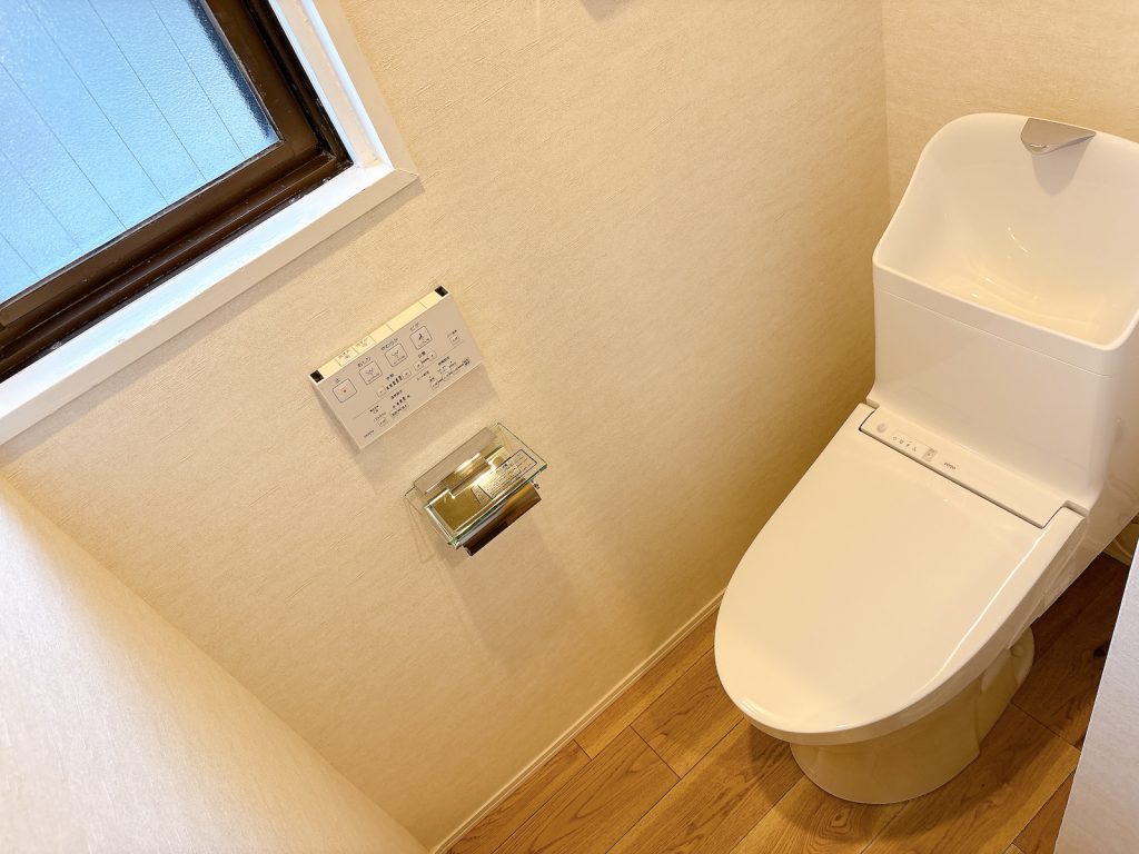 トイレは窓利用の自然換気。換気扇はついていませんでした。上部にキャビネット付き。