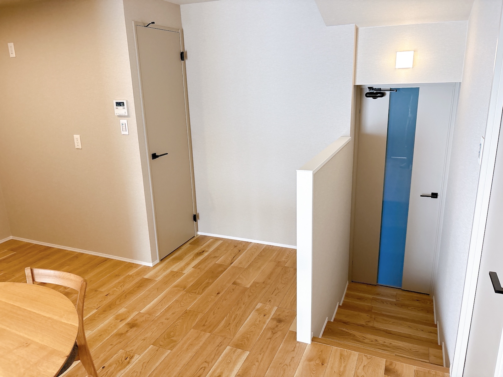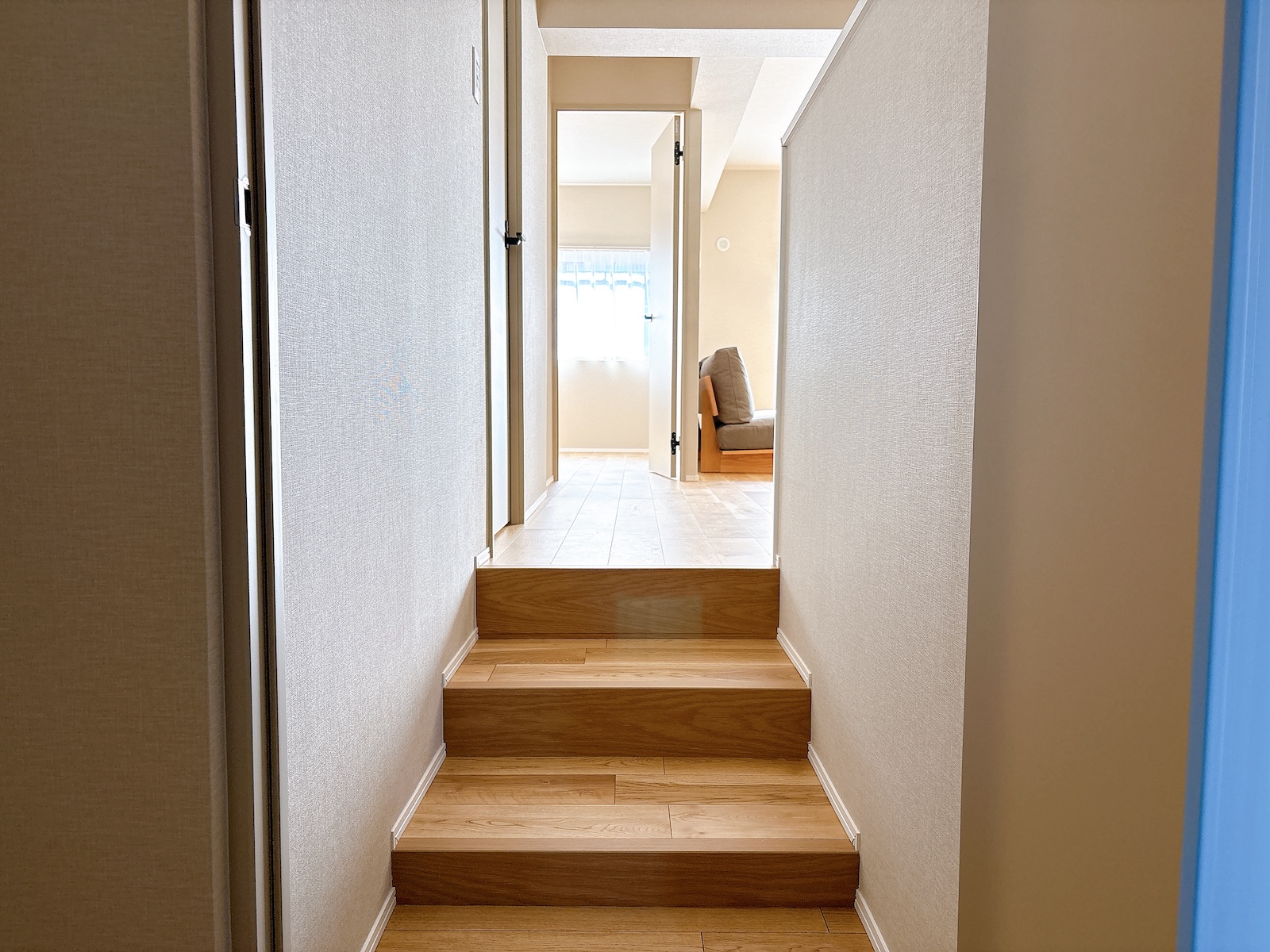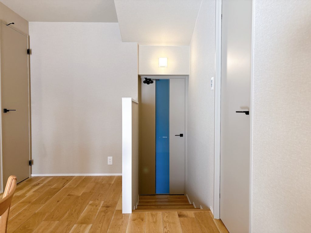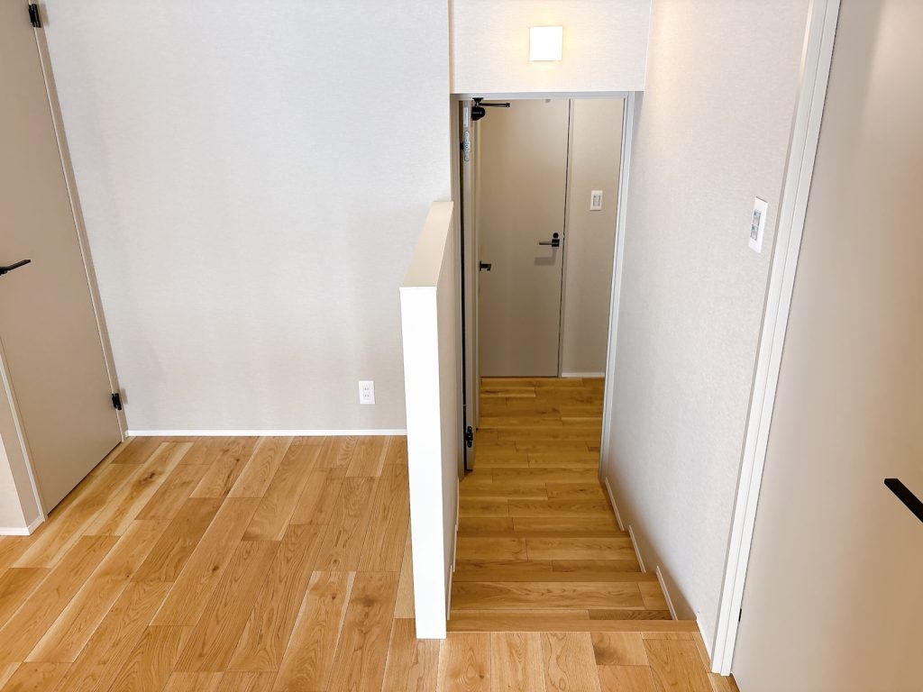 玄関通路から3段分上がったレベルにLDKがあります。このわずかな高低差が、北(落ち着いた通路側)と南(明るいリビング側)を緩やかに分け、空間に心地よい変化をもたらしています。