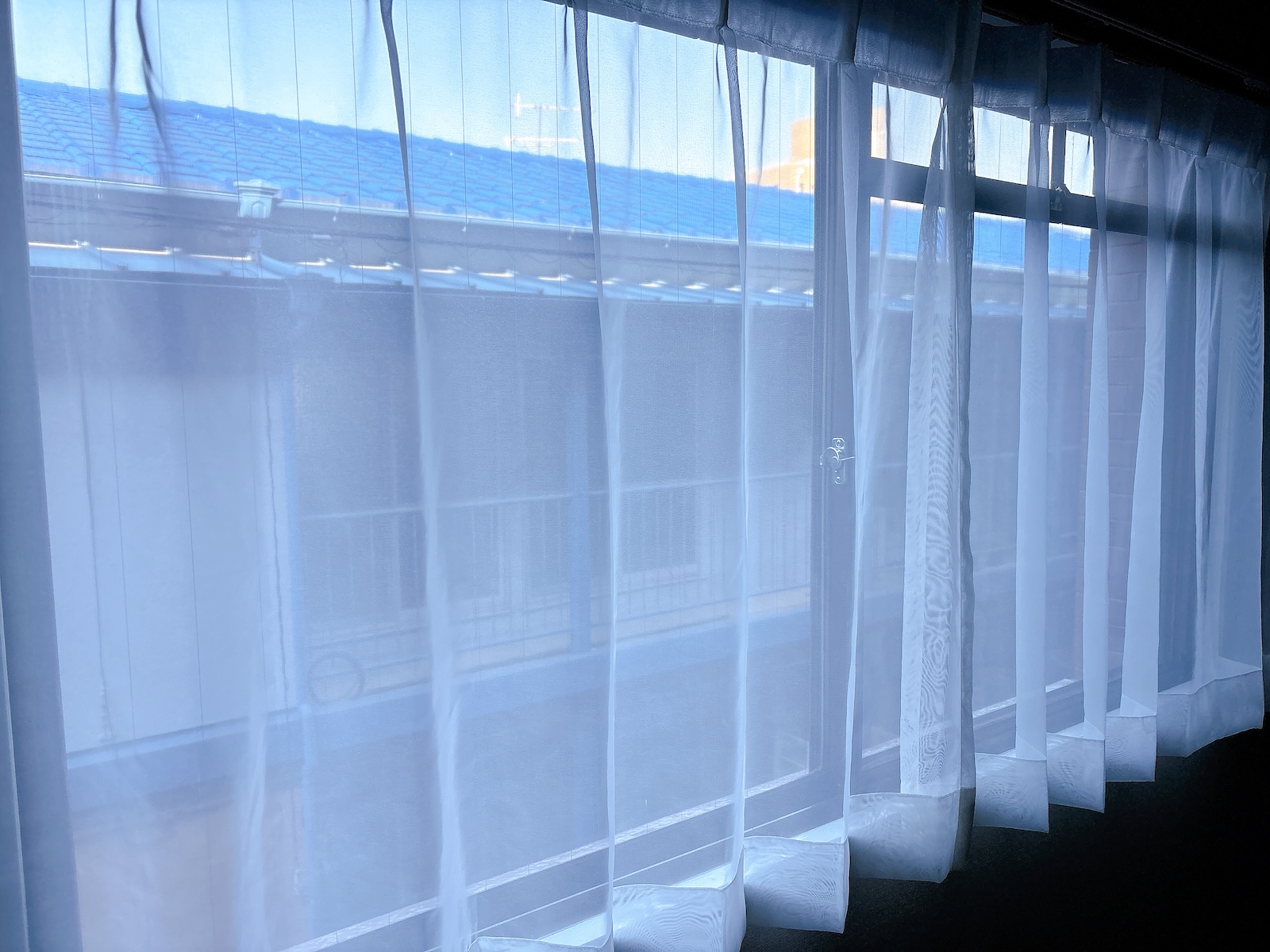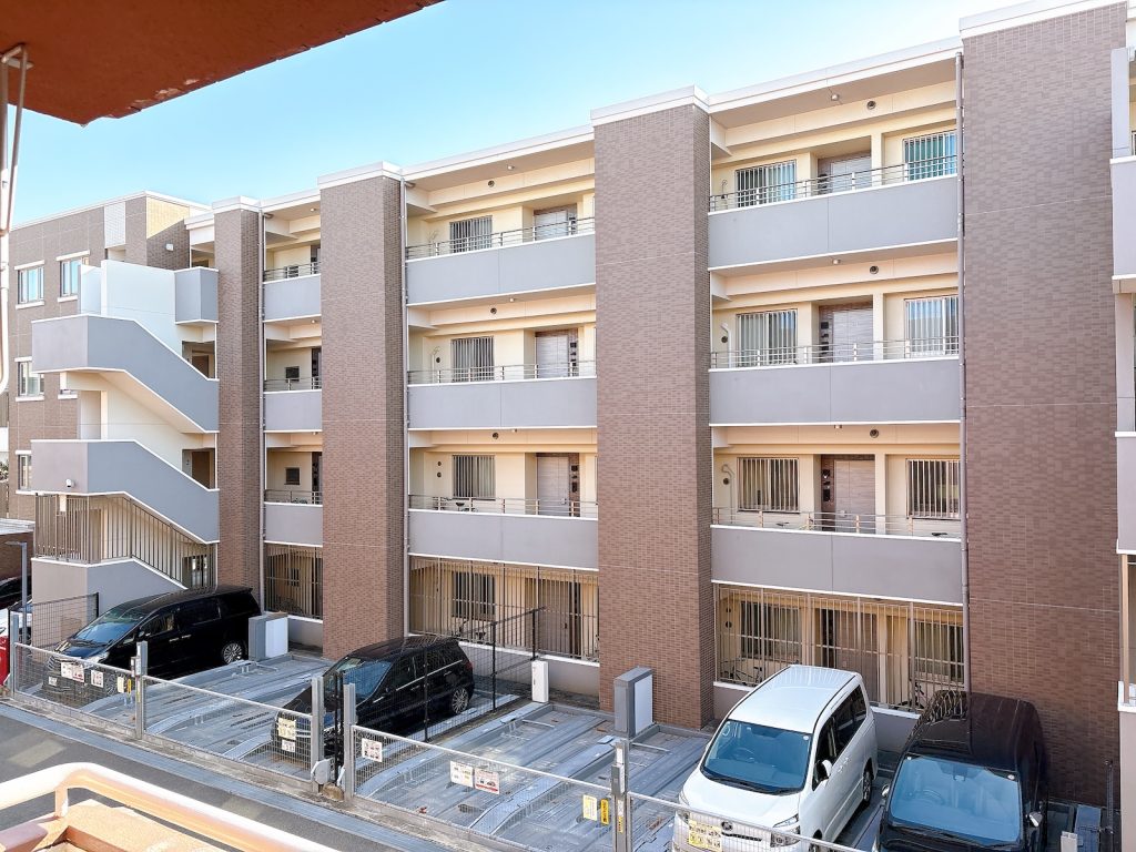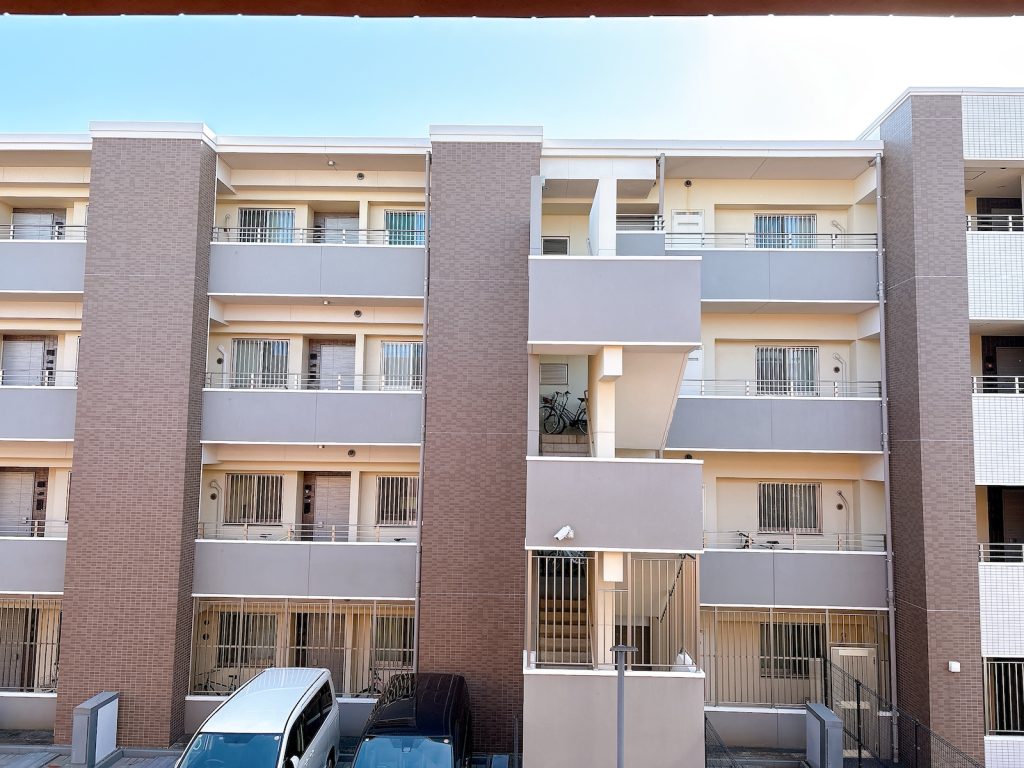 バルコニー前面に隣のマンション。ただ、距離があるし向こうも低層なので圧迫感はありません。空も見える!