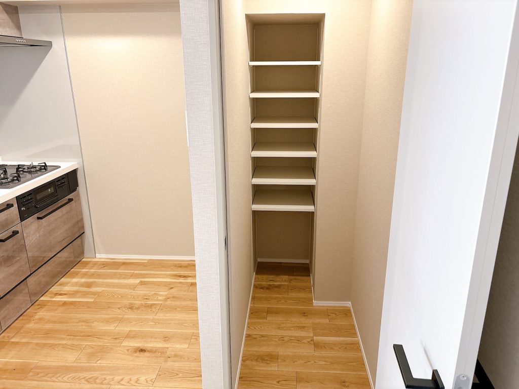 パントリーにも使える収納があって機能的に使えそう。階段横の腰高壁にもモノを寄せて置けます。