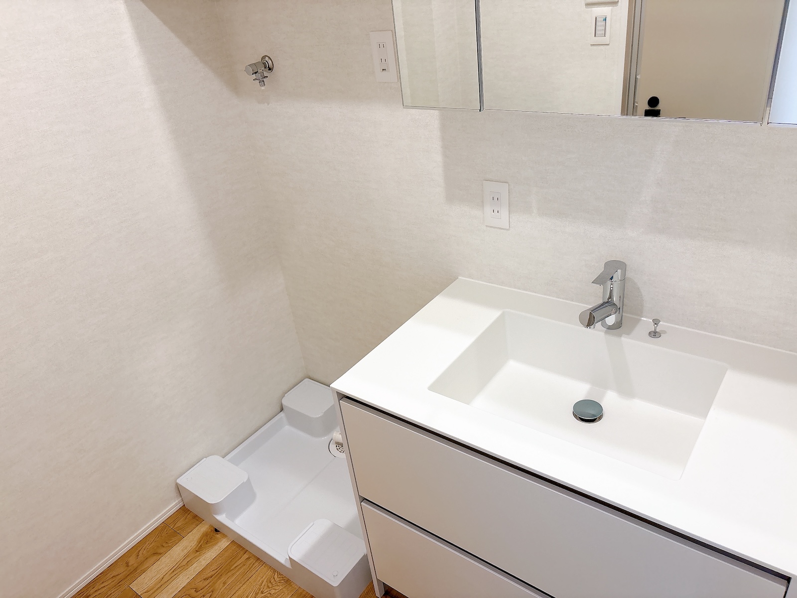 洗面台はW900。写真には写っていませんが、洗濯パンの上部にキャビネット付き。