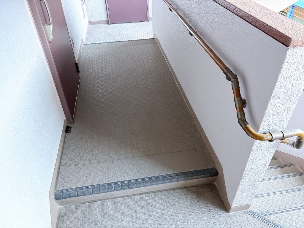 共用部に少し気になる段差があります。通路に一度上がってまた下がるという……現地にてご確認ください。