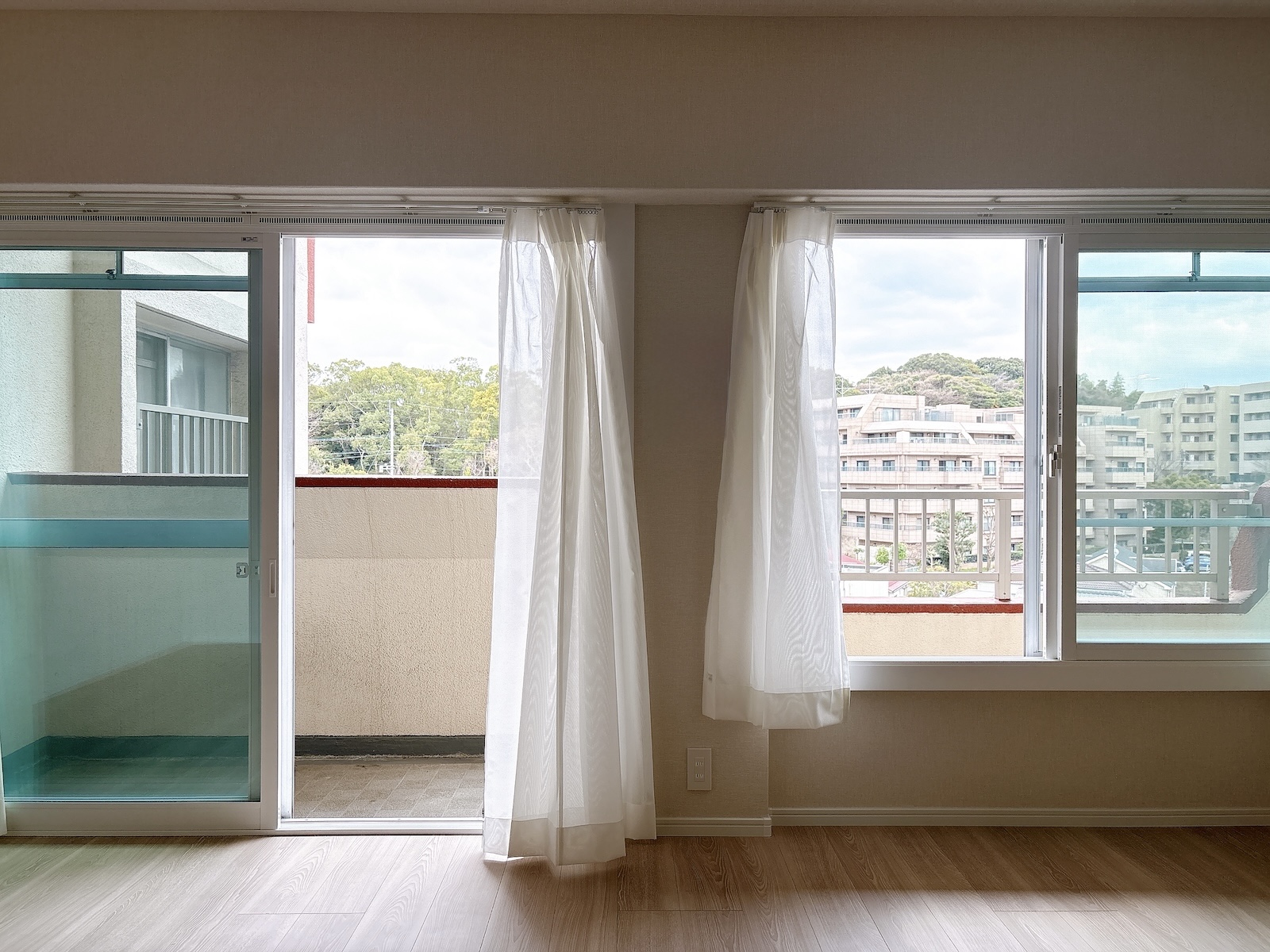 向かって左側にはお隣さんの窓が視界に入るため、通常は掃き出し窓の部分をレースのカーテン等で調整し、視線を和らげながら過ごすことになりそう。