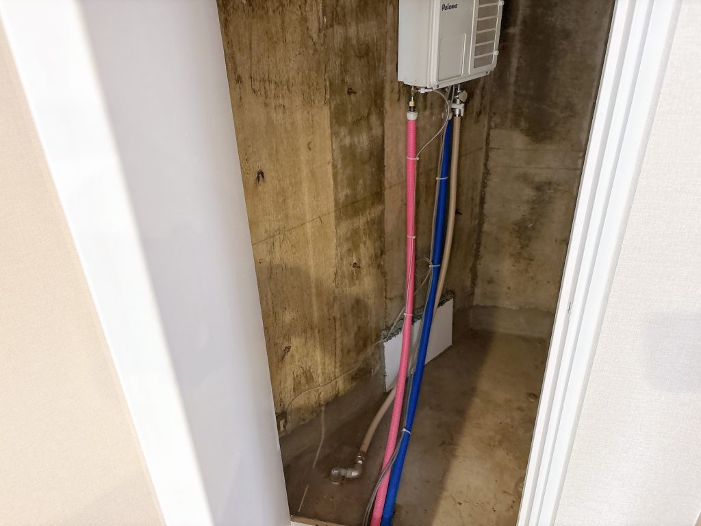 奥の白いドアの向こうは物置のようになっていて、給湯器が設置されています。