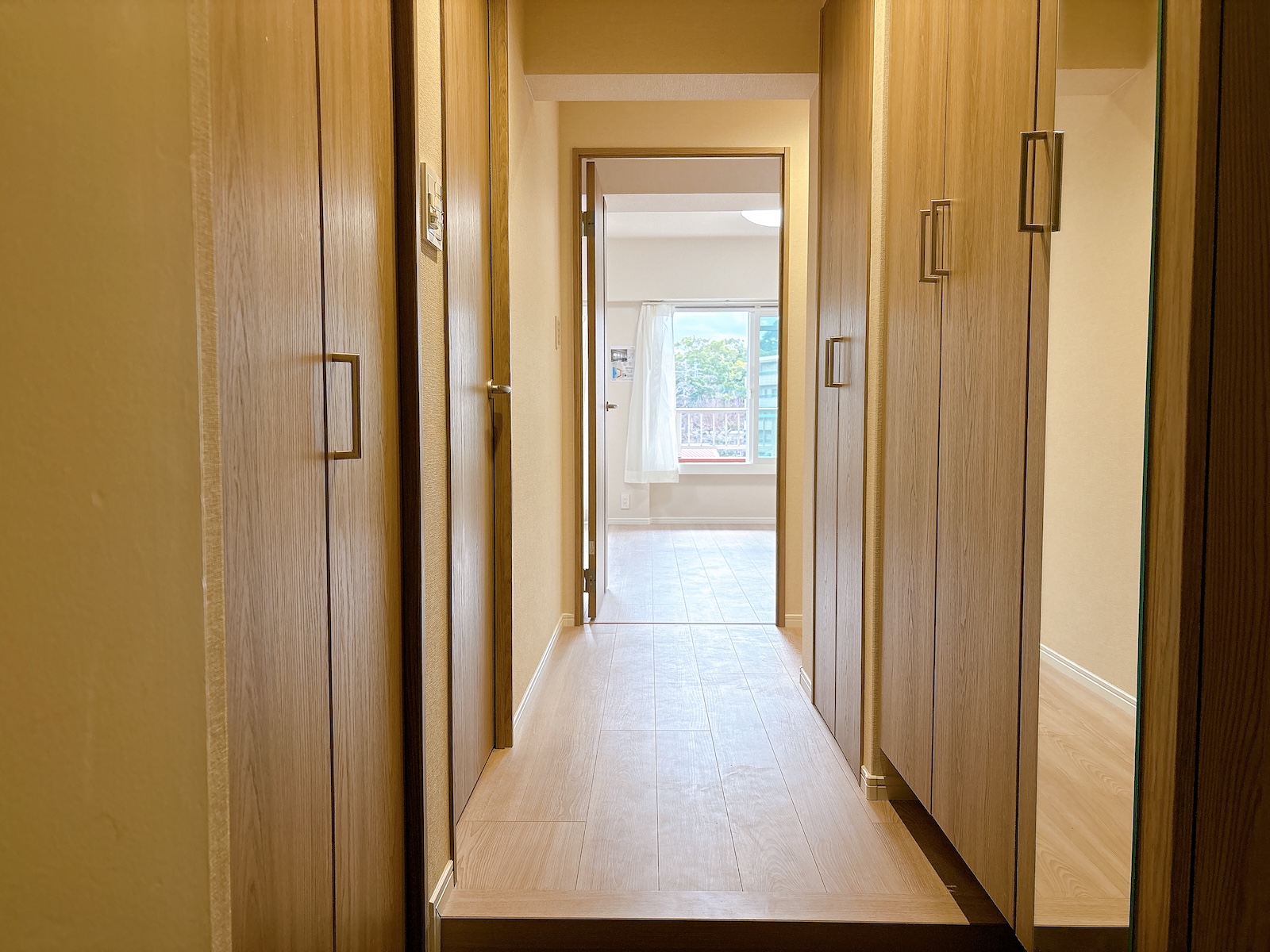 写真ではわかりづらいですが、玄関や通路の収納も充実。間取りでご確認ください。